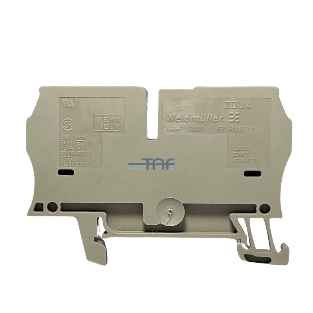 بلوک ترمینال ریلی Weidmüller 1632050000 از سری ZDU 4 یک بلوک ترمینال عبوری با اتصال گیرهفنری (Tension Clamp) است که برای اتصال ایمن هادیها در تابلوهای برق و سیستمهای صنعتی طراحی شده است. این ترمینال تکسطحی دارای دو نقطه اتصال است و با طراحی جمعوجور، نصب و سیمکشی را در فضاهای محدود آسان میکند.