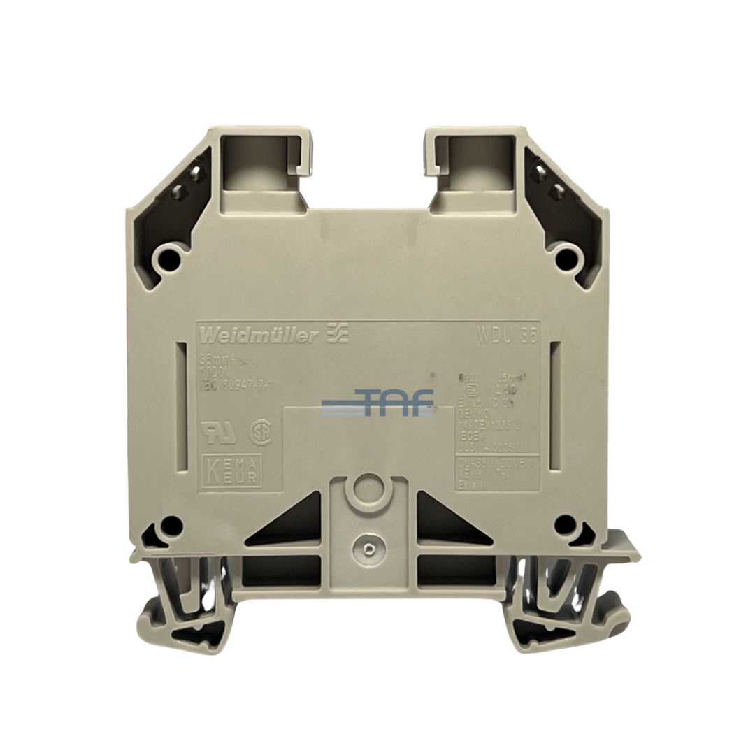 ترمینال ریلی WDU 35 از برند Weidmüller به رنگ قهوه‌ای و با طراحی تک‌سطحی عرضه می‌شود. این محصول از سیم‌هایی با سایز 12 تا 2 AWG پشتیبانی کرده و در سری WDU قرار می‌گیرد. روش اتصال آن پیچی بوده و سطح مقطع کابل قابل استفاده 35 میلی‌متر مربع است. ولتاژ نامی این ترمینال 1 کیلوولت و جریان نامی آن 125 آمپر می‌باشد. حداقل دمای عملیاتی 50- درجه سانتی‌گراد و حداکثر دمای عملیاتی 120+ درجه سانتی‌گراد است. این محصول دارای گواهینامه ATEX برای استفاده در مناطق خطرناک می‌باشد.