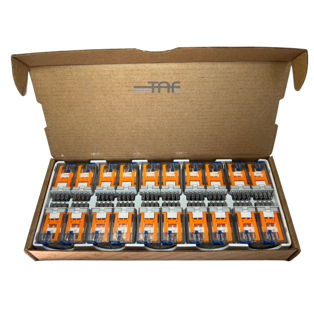 این رله با ولتاژ ۲۴ ولت DC روی بوبین فعال می‌شود و باعث قطع و وصل هم‌زمان ۴ مسیر از طریق ۴ کنتاکت تبدیلی می‌گردد. به دلیل طراحی دقیق و ساختار مطمئن، این رله برای کنترل بارهای کوچک، سیگنال‌ها و بخش‌های مختلف مدار فرمان کاربرد دارد.