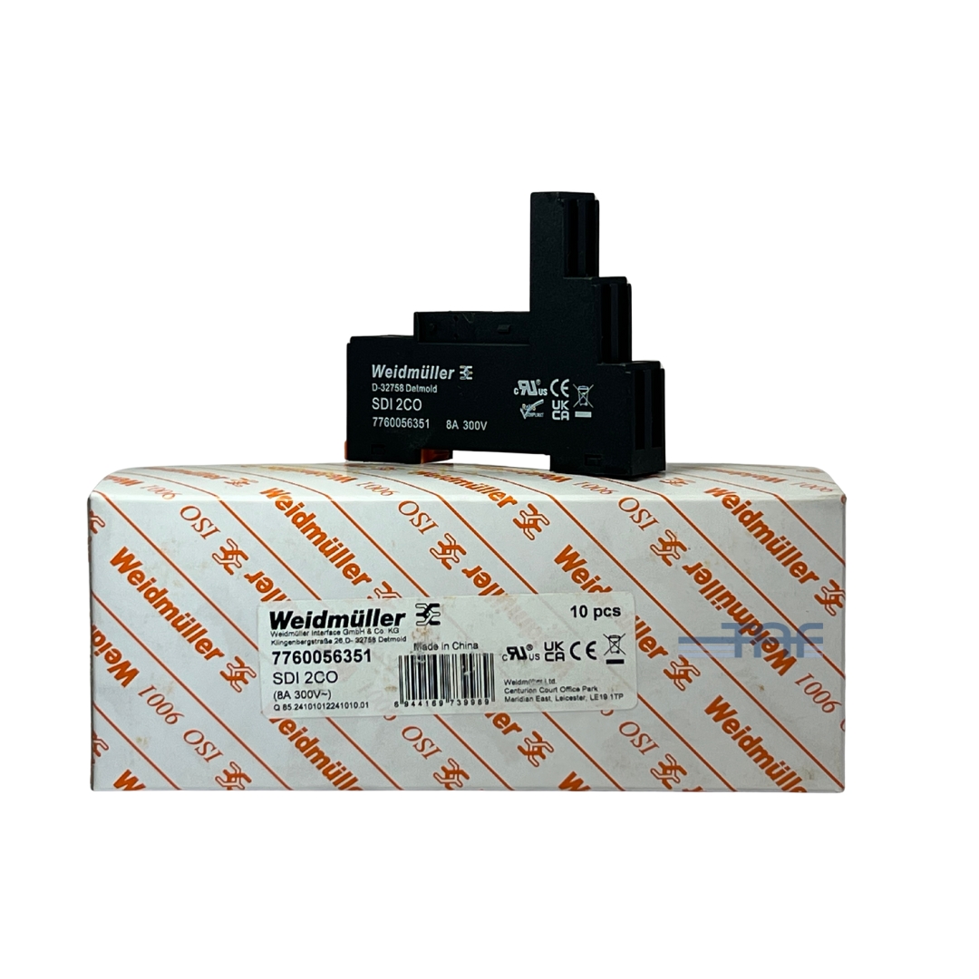 سوکت رله SDI 2CO با پارت‌نامبر 7760056351 از شرکت وایدمولر (Weidmüller)، یک پایه یا سوکت استاندارد صنعتی است که برای نصب و راه‌اندازی رله‌های سری D‑Series DRI طراحی شده است. این سوکت به‌عنوان رابط بین رله شیشه‌ای یا الکترومکانیکی و مدار فرمان استفاده می‌شود و اتصال رله را در تابلوهای برق و سیستم‌های کنترل با حداکثر ایمنی و پایداری الکتریکی فراهم می‌کند.