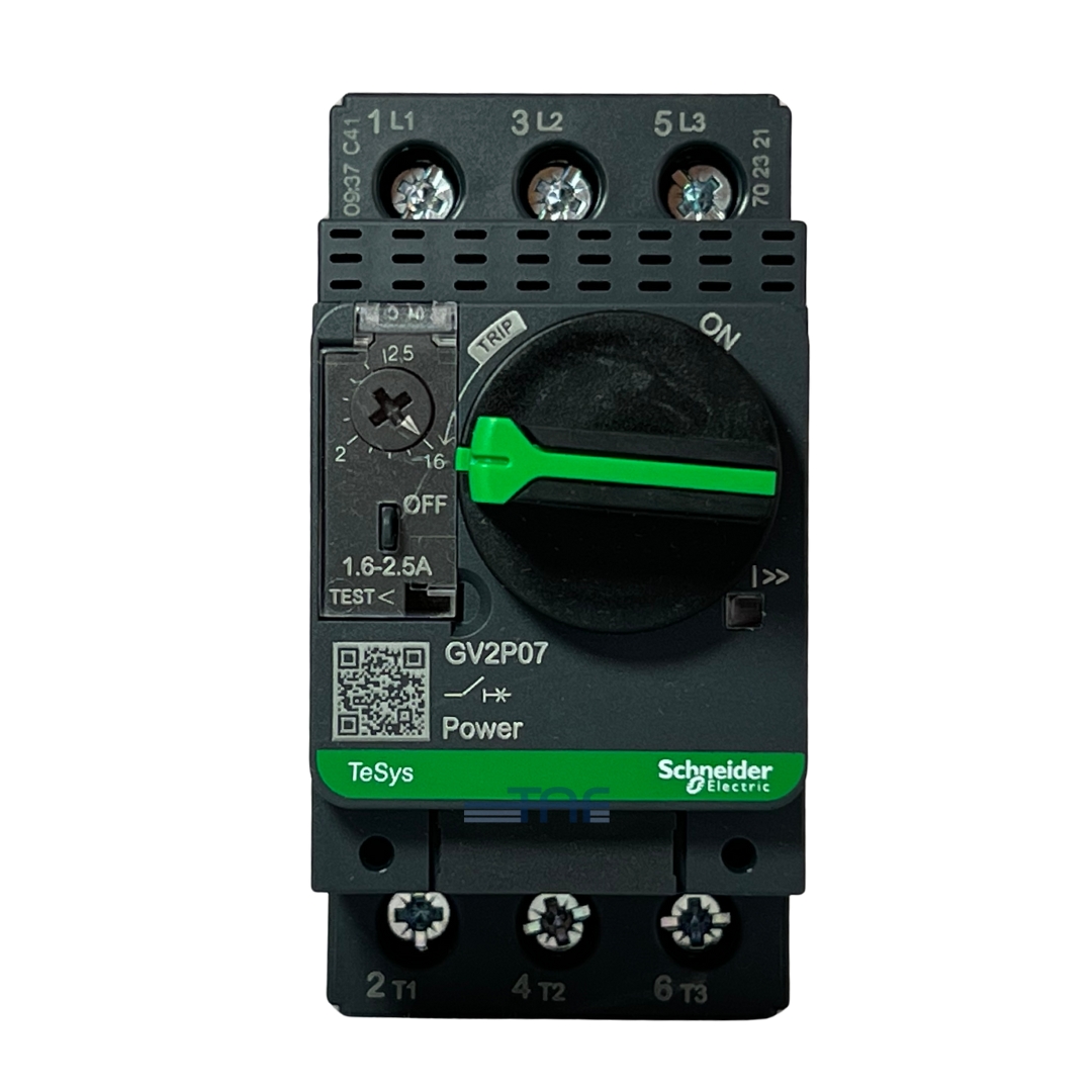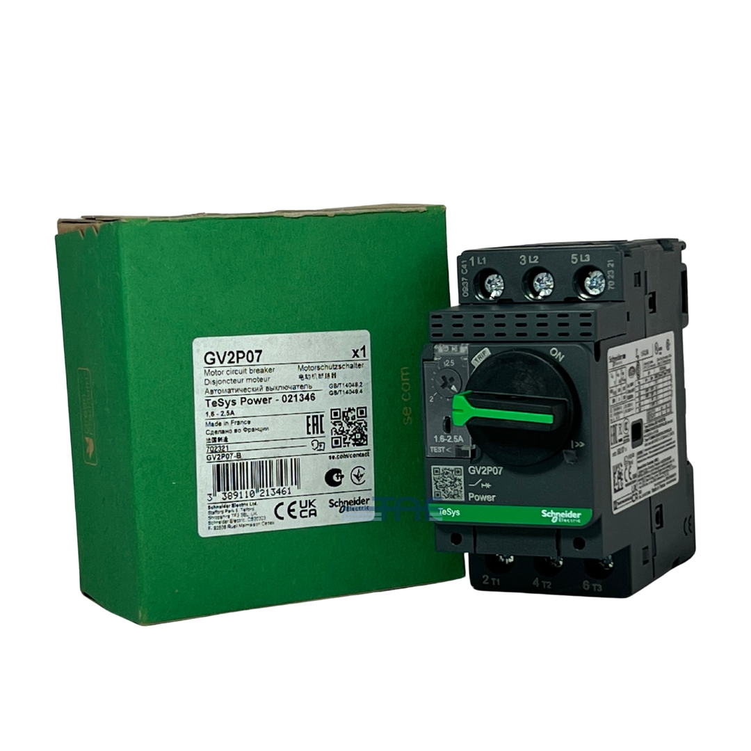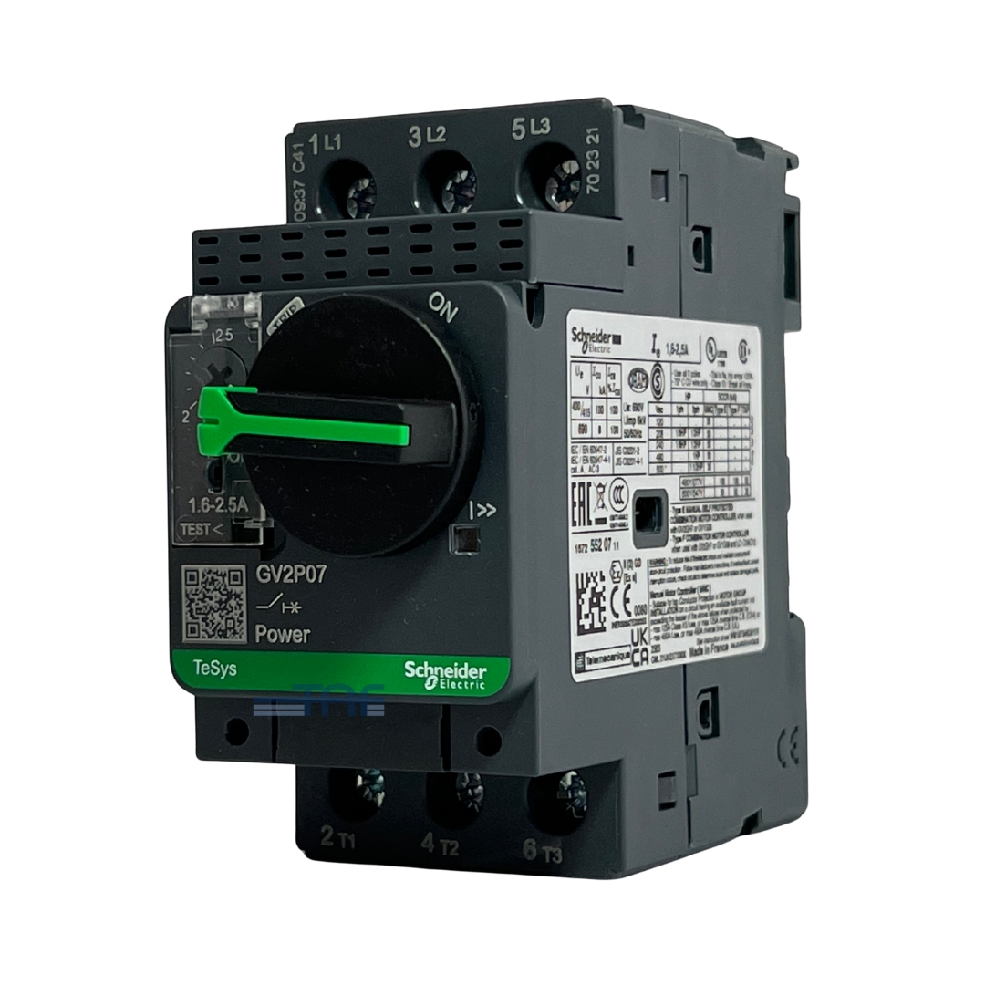 کلید حرارتی-مغناطیسی GV2P07 از سری TeSys GV برند اشنایدر، یک کلید سهپل (3P) است که تا جریان نامی 2.5 آمپر و ولتاژ کاری 690 ولت در فرکانس 50–60 هرتز عمل میکند. این کلید مناسب موتورهای سهفاز با توان 0.75 کیلووات در ولتاژ 400 ولت است.