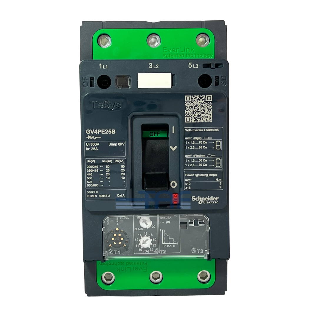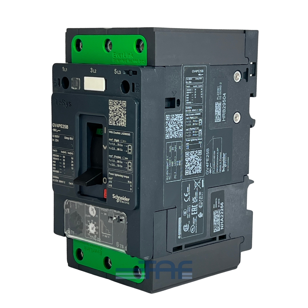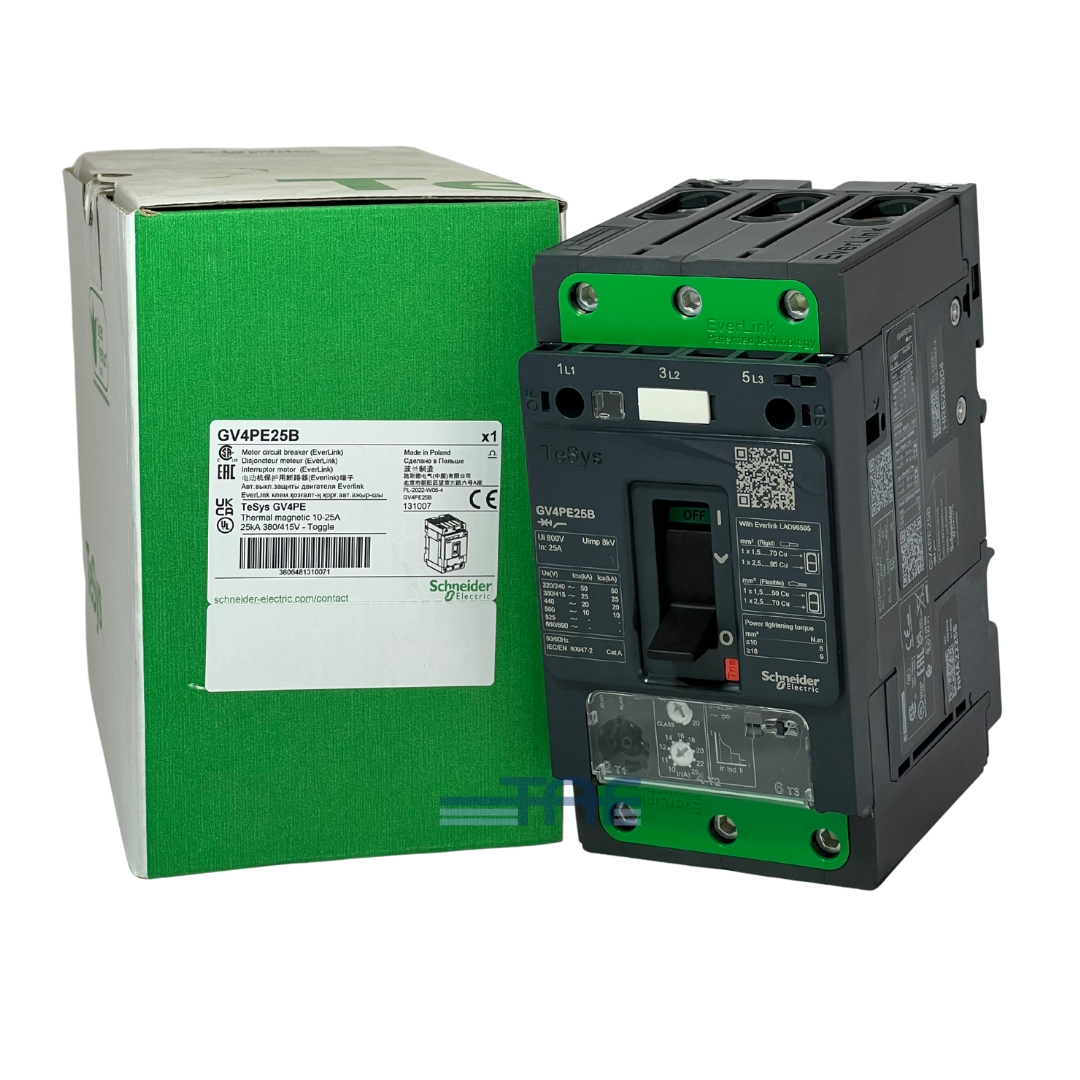 کلید GV4PE25B قابلیت محافظت از موتور در برابر عدم تقارن فاز، قطع فاز و خطای زمین را داراست. در داخل محفظه آن، محل نصب تجهیزات جانبی مانند کنتاکتهای کمکی OF و SD و همچنین رلههای شنت تریپ و آندر ولتاژ (MN و MX) پیشبینی شده است. این محصول دارای استانداردهای بینالمللی (IEC, UL, CSA, CCC, EAC, Marine, ATEX) بوده و مطابق با الزامات زیستمحیطی RoHS/REACh تولید میشود.