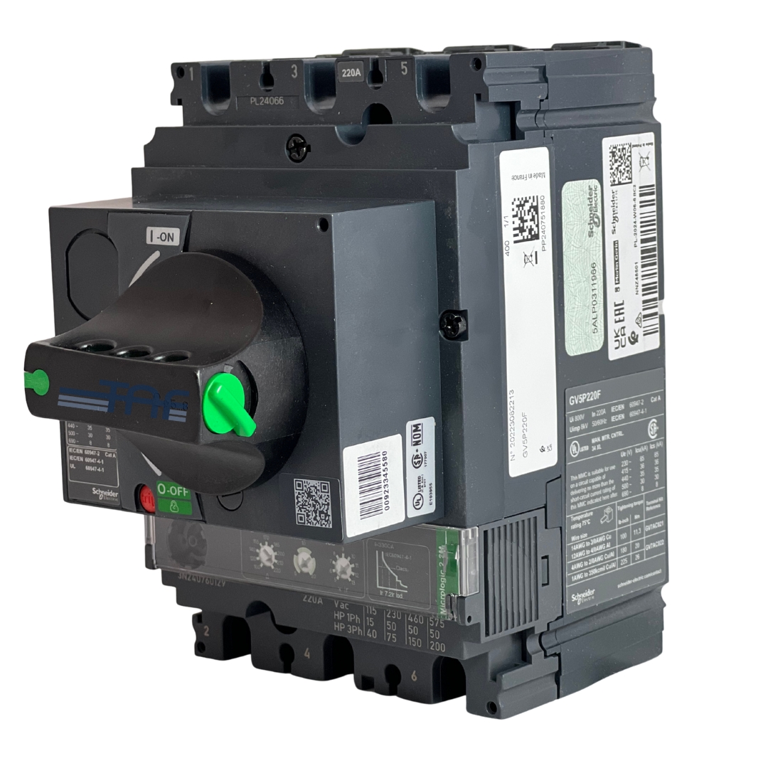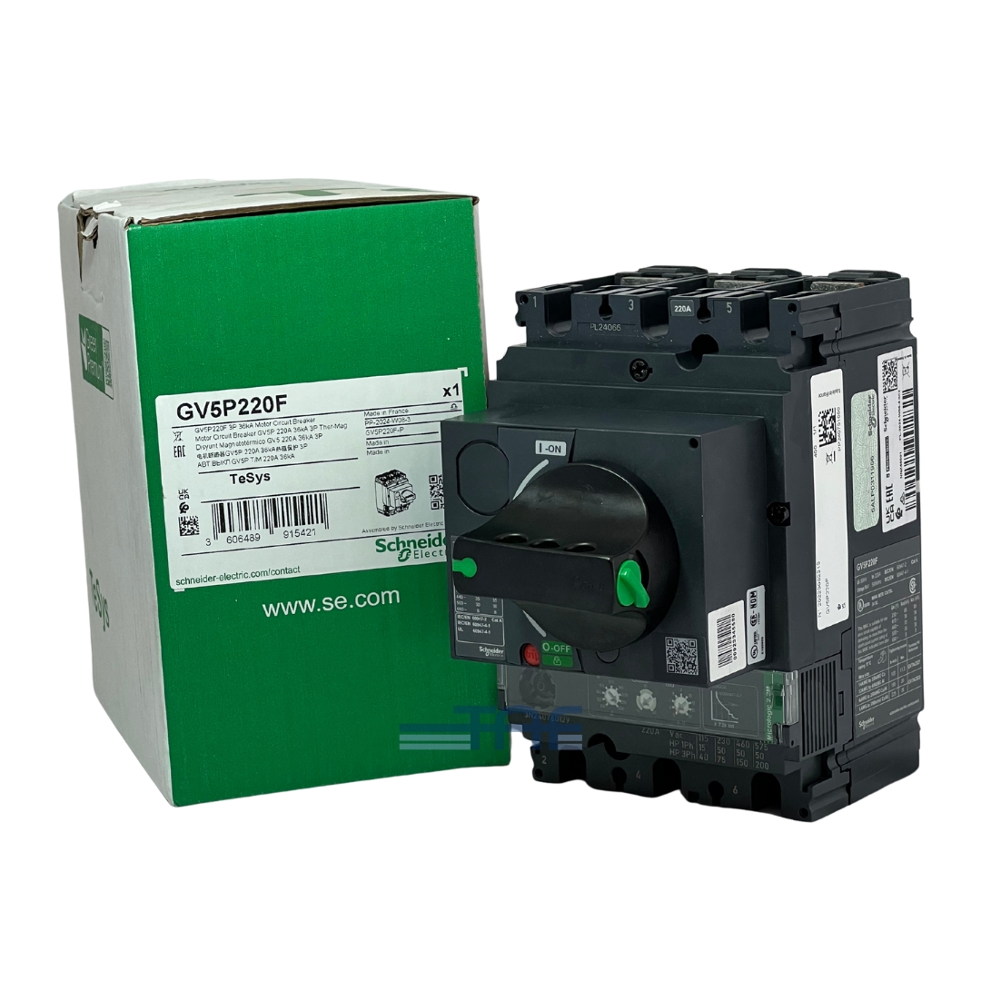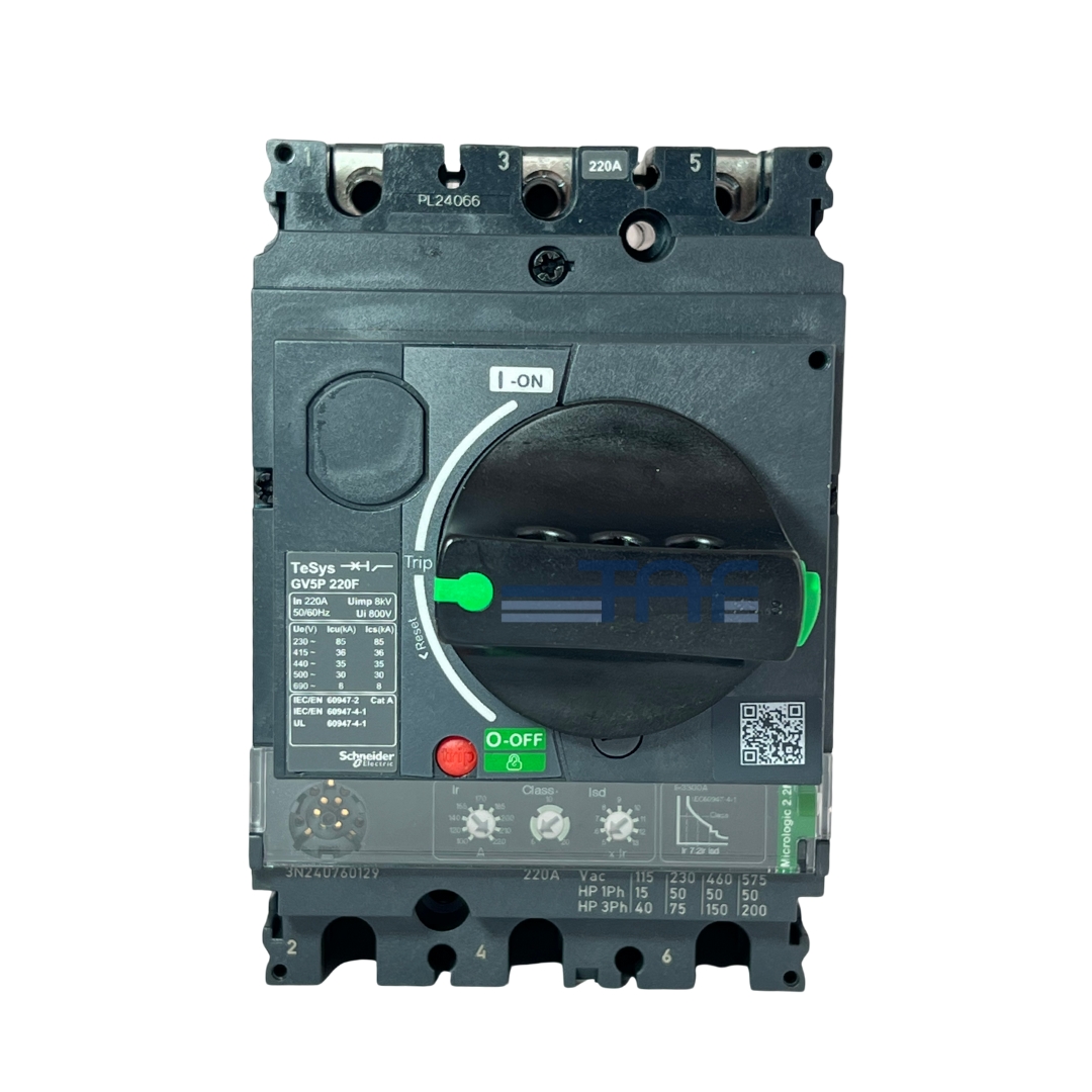 کلید حرارتی مغناطیسی اشنایدر با کد فنی GV5P220F از سری TeSys GV، یک کلید سهپل (3P) است که با جریان نامی 220 آمپر و در ولتاژ 690 ولت عمل میکند. این کلید جهت حفاظت از موتورهای سهفاز با توان 90 تا 110 کیلووات در ولتاژ 400 ولت به کار میرود.