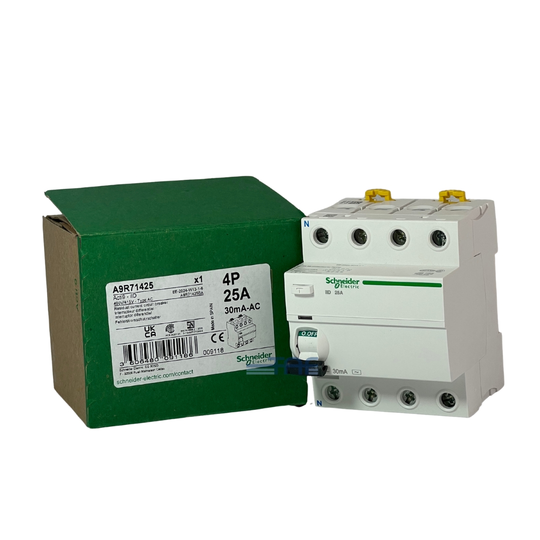 محافظ جان A9R71425 یک کلید چهار پل (4P) بوده و برای سیستمهای سه فاز به همراه نول طراحی شده است. این کلید با ولتاژ نامی 380 تا 415 ولت AC تغذیه میشود و جریان نامی آن 25 آمپر است. حساسیت نشتی جریان در این مدل 30 میلیآمپر بوده که برای حفاظت مستقیم از افراد بسیار مناسب است.