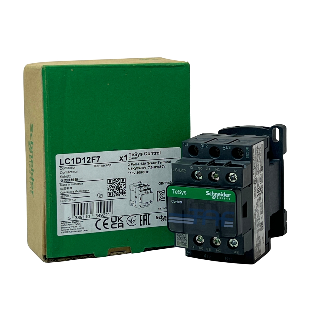 کنتاکتور LC1D12F7 با ولتاژ کنترل 110 ولت AC عمل می‌کند و ولتاژ کاری نامی آن در مدار متناوب تا 690 ولت با فرکانس 25 تا 400 هرتز قابل پشتیبانی است. همچنین حداکثر ولتاژ نامی در مدار مستقیم (DC) برابر با 300 ولت می‌باشد.
