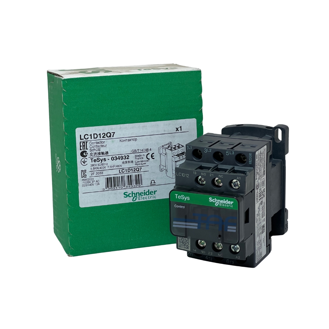 کنتاکتور اشنایدر با کد LC1D12Q7 و نام اختصاری LC1D از تجهیزات پرکاربرد در مدارهای قدرت است که برای قطع، وصل و کنترل بارهای موتوری و مقاومتی مورد استفاده قرار می‌گیرد. این کنتاکتور در سیستم‌های سه‌فاز به‌کار می‌رود و در رده‌های کاری AC-1، AC-3، AC-3e و AC-4 عملکرد مطلوبی داشته و برای انواع موتورها و بارهای مقاومتی با سیم‌پیچی‌های مختلف مناسب است.